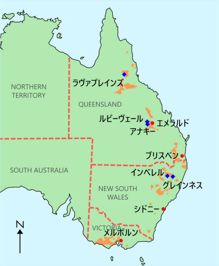 オーストラリアでは1850 年頃のゴールドラッシュでサファイアが発見されて以降、主に大陸東部のアルカリ玄武岩の噴出地域に500 箇所以上の産出地が発見されて来ました。これらのうち商業的に重要な産地は3か所で、北から南へクイーンズランド(QLD)州北部のラバープレインズ(Lava plains)、クイーンズランド(QLD)州中部のルビーベイル(Ruby vale)/アナキー(Anakie)地域、そしてニューサウスウェールズ(NSW)州北部のインベレル(Inverell)/グレンイネス(Glen Innes)地域です(図-1)。