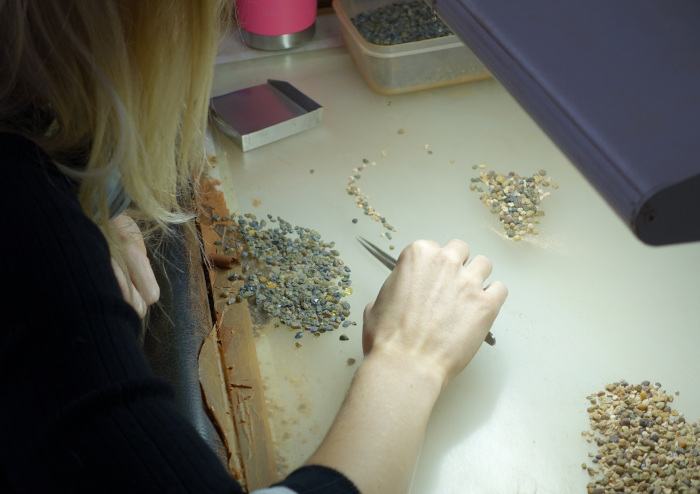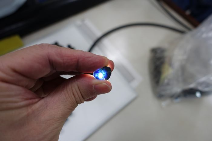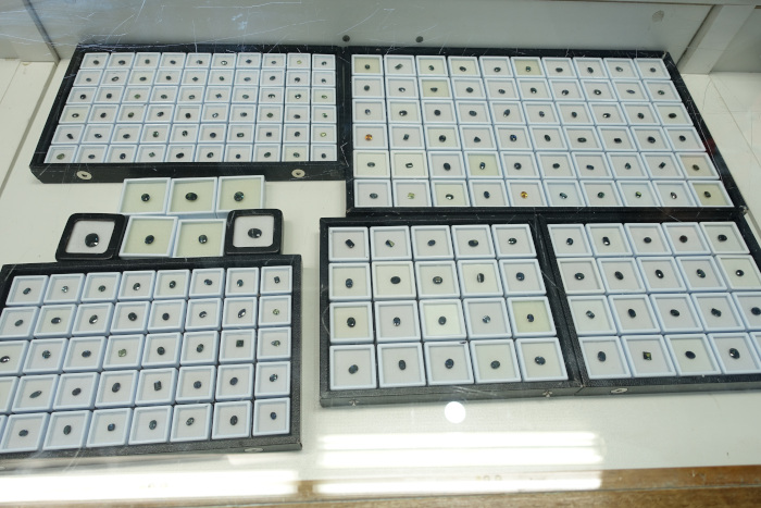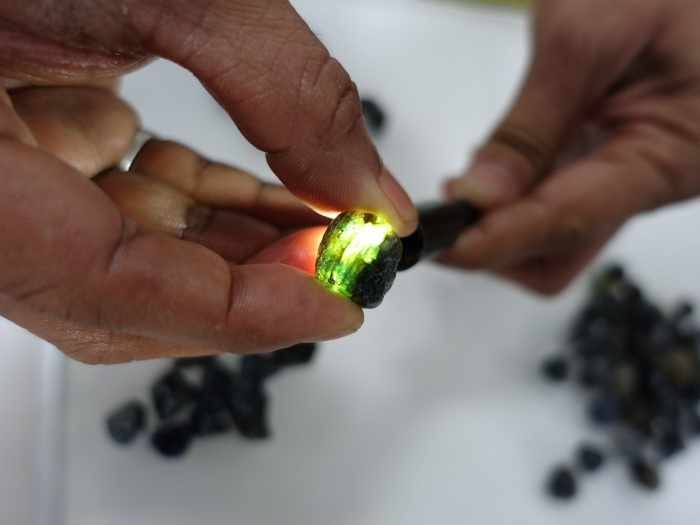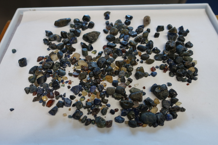 FURA Gemsはこの地域に現在2つの巨大なプラントを稼働させています(写真-25)(写真-26)。採掘された土砂は大型のショベルカーで運ばれ(写真-27)、大型鉱石洗浄機に掛けられます(写真-28)。ここでは水とともに回転ドラムで粘土や不要物が除去され、振動スクリーンを通して重鉱物が分別されていきます(写真-29)。この段階ではサファイアの他にスピネル、ジルコン、イルメナイト、マグネタイト、オリビン、パイロキシン、アンフィボールなどの鉱物も残ります。その後は磁気選別(写真-30)により、イルメナイトやマグネタイトなどの磁力のある鉱物を取り除き、目視選別(写真-31)を経てサファイアが分離されます。分別されたサファイアは二次鉱床のためやや丸みを帯びた形状を示します(写真-32)。鉱山責任者のSuminda Galketiya氏によると、大型トラック一杯あたり10トンの土砂を一日に1200トン処理して最終的に多い日で8-10kgのサファイアが得られるそうです(写真-33)。採取されたサファイアはサイズや色ごとに分別されます(写真-34)。多くのものは濃色で黒っぽく見えますが、透過光では美しいブルーです(写真-35)。グリーンやイエローの他に稀にオレンジ色やピンク色も見つかります(写真-36)。その後、多くのものはタイに送られ加熱処理が施されます。