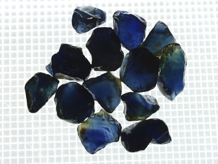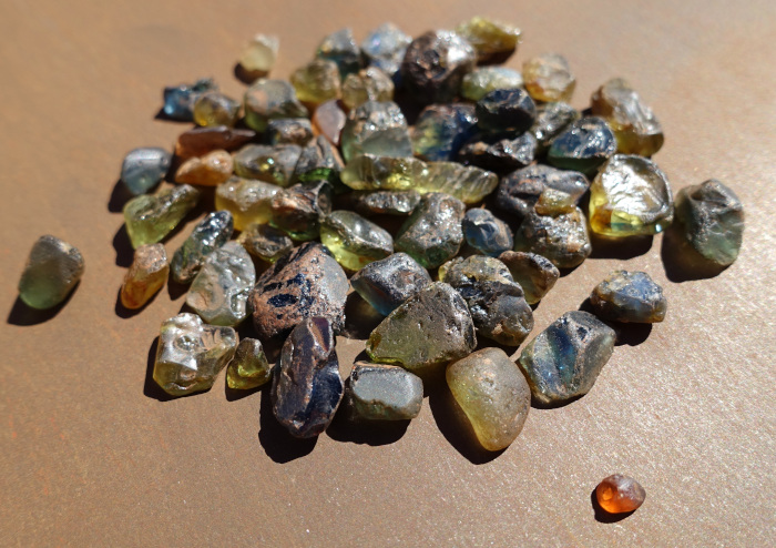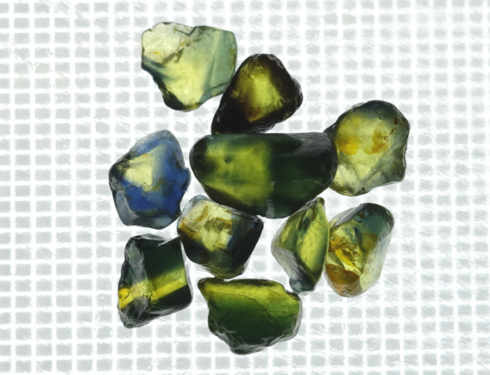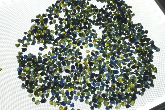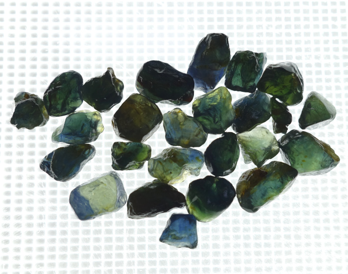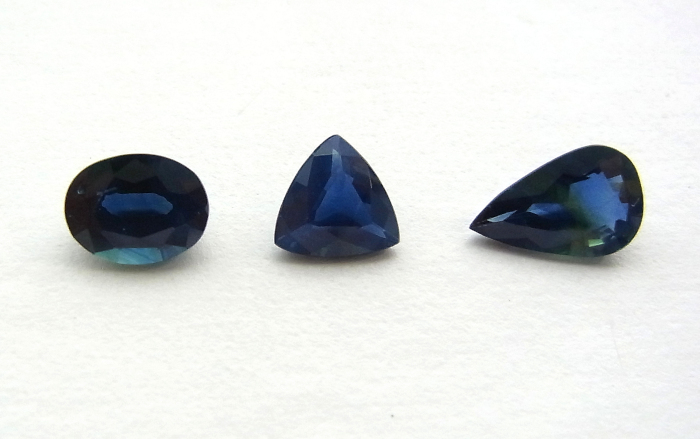 オーストラリア産のサファイアは、玄武岩関連起源で鉄分を多く含むため、一般的に「インクのような深い青」が特徴です(写真-5)。オーストラリアで商業的に産出するサファイアの70-90%は濃青色のサファイアです。その他にブルーグリーン、グリーン、イエローなどが見られます(写真-6)。