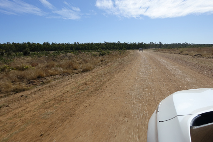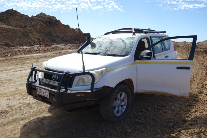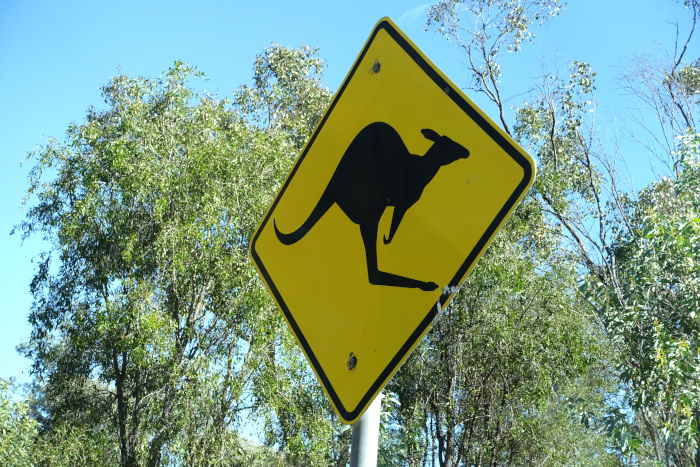 交通手段として、アナキー・サイディングから東方40kmのエメラルドという町まではブリスベンから国内線による空路が複数便/日あります。エメラルドは人口15000人ほどの町ですが、ホテル、レストラン、スーパーマーケットがあり、ジェムフィールズ滞在の拠点となります。エメラルドからは車で路線番号A4のカプリコン・ハイウェイを利用して(写真-14)、40分ほどでサファイア鉱区のあるアナキーの町に到着します(写真-15)。ハイウェイは舗装されており、快適な道のりですが、鉱山が近くなると未舗装の道が続きます(写真-16)。道中は、オーストラリアだけあってカンガルーや野生動物に注意の標識が出ています(写真-17)。カンガルーは夜行性で、突然ジャンプして道路を横切るため、夜間の走行は危険が伴います。実際、所々に衝突の痕跡(遺骸)が残されています。カンガルーとの衝突は車への被害も大きくなるため、地方を走行する車のほとんどにはカンガルー・バーと呼ばれる車体を保護する装備が付けられています(写真-18)。