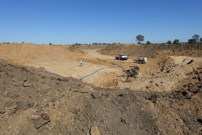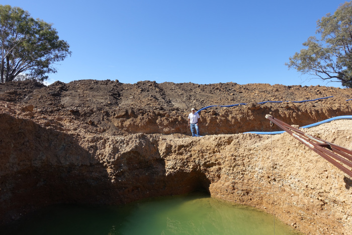 FURA Gemsによるサファイア鉱床の探鉱には最新の技術も使われています。重力異常の観測や航空磁気探査による広域的な地質構造の解明、衛星画像を用いて赤色酸化鉄の痕跡(風化した玄武岩は鉄分が多く赤っぽい土となる)の確認などが行われます。そして現地踏査を行い、地形や堆積環境の調査によりある程度の候補地を選定します(写真-21)。候補地ではグリッドごとに深さ30mほどのボーリング調査が行われ、サファイアを含む層の有無や層厚が調べられます(写真-22)。候補地が絞られると重機を用いた露天掘りによる試掘が行われ(写真-23)、経済的に採掘可能かが見積もられます。この地域は乾燥地帯のため、選鉱に必要な水を確保するために年に2回ほどある大雨の時期に試掘跡に水を貯めています(写真-24)。